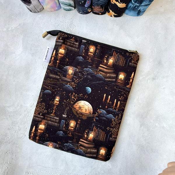 This sleeve is made from cotton canvas with a slip pocket in the front big enough to hold your kindle or e-reader, bookmark, tabs, pens, highlighters or even your phone. The soft cotton lining, along with fleece padding will keep your book safe and sound! The sleeve is finished off with a nylon zipper that lets the sleeve open really wide, so you can fit even the thickest book without it catching on the zipper teeth. The zipper is finished with a metallic zipper end for a polished look!