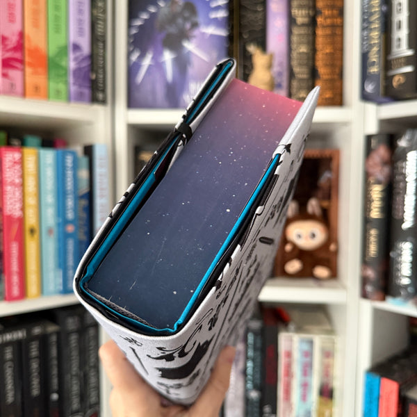 This fabric dust cover is made from a high quality custom printed cotton canvas, with a cotton liner inside. Each dust cover is adjustable to a variety of book thicknesses, with an adjustable flap at the back that is secured by a built in elastic.  There are 4 sizes to fit most hardback and paperback book heights. Each size has a range, so the larger range will be more snug, and the smaller range will have a little bit of play. This allows your to reuse your jacket for multiple books in your library!