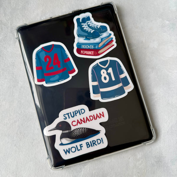 An awesome collection of four die cut Hockey Romance stickers.